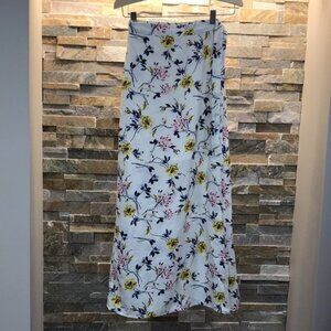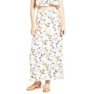 Delicate stems decked out in pink and yellow blooms sweetly dance atop a wrap-style maxi skirt.