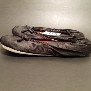 Black satin upper, off-white suede soles. Elasticized with bow trim.