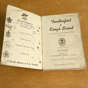 Tenderfoot to King's Scout, The Canadian Boy Scout's Guidebook of Tests, as Revised 1949. From my Father-in-law's library. Selling 19 scouting books. Water damage seems to be the first and last few pages and the edges. He was the Dad who would organize some type of fun activity with the neighborhood kids while the other Dad's were relaxing at home after work.