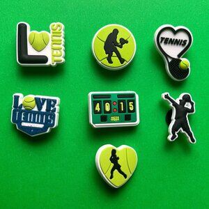 Serve up some style with this set of 7 tennis-themed shoe charms! Featuring racquets, balls, and other sporty designs, these charms are perfect for tennis enthusiasts looking to bring their love for the game to their Crocs or clogs.