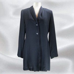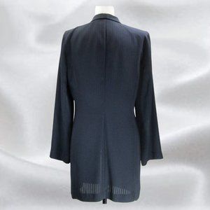 This made in Canada Tenzer Navy Blue Pinstriped long suit jacket with 2 button closure in size 8 looks great over its fully lined matching skirt in size 10. Excellent pre-owned condition with no flaws. Measurements in photos - note measurements taken flat and unstretched. Waist, Hip and armpit to armpit (chest) is then doubled.