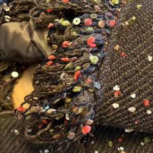Skirt tags size 10, Jacket tags removed but fits like a small size 10. Fitted jacket with full length sleeves. Fringe on cuff, collar, hem and along front of jacket approximately 2.5 inches in length