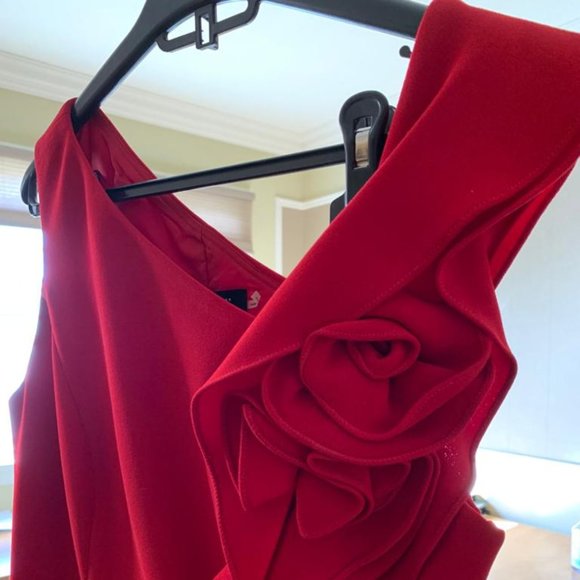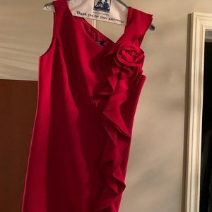 Bright red Teri John by Rickie Freeman Size 6 dress with big flower on left upper bust, and ruffles along left side. Zipper on the back of the dress.