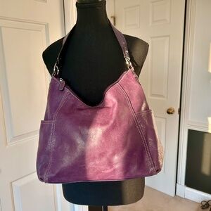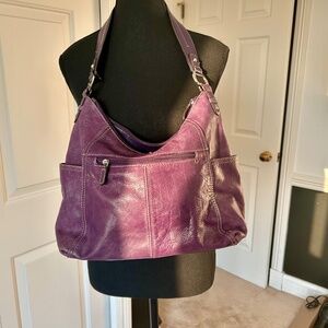 This Terra purple purse is made of buttery soft leather. All of the hardware is silver coloured metal. It has a shoulder strap that is 22” long. The dimensions of this purse are: Length- 14” Width- 4.5” and Height- 11”. This purse is divided into 3 equally sized areas. There are two zipper enclosed pockets with a space in between that has a magnetic snap. The centre are of this purse has pockets for essential or small items that you do not want to fall to the bottom. On the opposite side of the centre compartment there is a small zipper enclosed pocket where items can be securely stored.There are open pockets on both ends of the purse. The back of the purse has a zipper enclosed pocket as well. This purse is in good condition. It has been gently used.