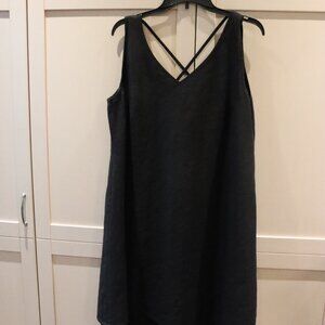 Beautifully made linen dress. Detail in back criss-cross. 93% linen and 7% Elastan. Drops with a tulip layer to add detail and flow to the dress. Very comfortable. Across bust line flat is 22" (x2), waist is 24.5" (X2) and length from under armpit to hem is 33.5". Other photos are the details on the back.