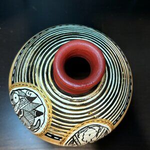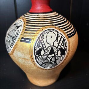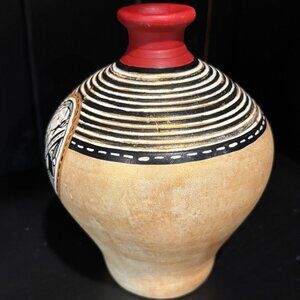 Terracotta Hand Painted Madhubani Matki Shaped Vase in Red, Gold and Black Hand Made in India. This is a gorgeous hand crafted and hand painted little vase with bright vibrant colors. Its an excellent accent piece to any home decor. It is not recommended to add water to the vase to hold real flowers, due to the delicate nature of the hand painting. This is a vintage piece with normal wear for its age, please inspect the photos closely, there are no chips or cracks.