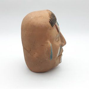 A terracotta head of the Mayan serpent god, Kukulcan. The figure likely comes from the Yucatan in Mexico where his worship was once centered. The figure has black with white, blue and white stripes painted on its face, There is some damage to the nose, please consult the pictures.