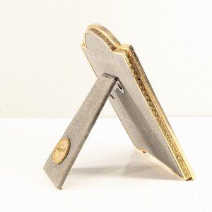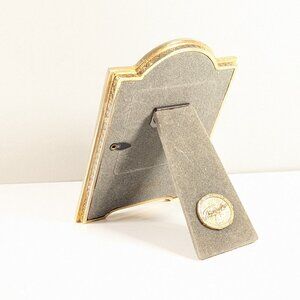 A sweet green enamelled picture frame by Terragraphics, very much in the style of much older Guilloche enamel frames, but dates ca 1990s. It is a fairly heavy weight free standing easel frame, with the round picture space, surrounded by a gold toned wreath of flowers. The colour is hard to capture and hovers between a metallic teal and somewhat more green (think: peacock feathers) Great for a little portrait frame of a loved one, or as a pet memorial frame on the mantle.