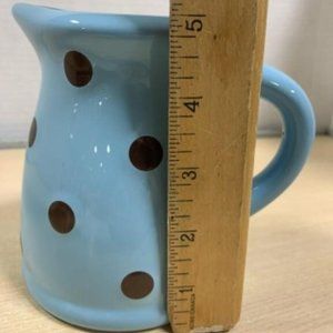 Fun Terramoto Ceramic pitcher/creamer. Blue with brown polka dots. 5" high. Holds 20 fluid ounces. 5 x 3.5 x 4.5 inches.
