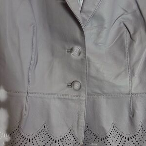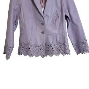 Elegant lavender blazer with unique scalloped edges. Perfect for a sophisticated look.