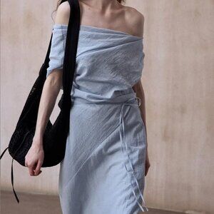 A draped off-shoulder midi dress in a textured silk blend — effortless elegance with sculptural softness.