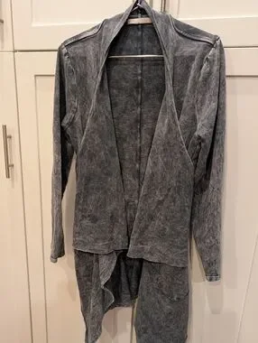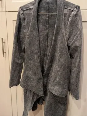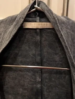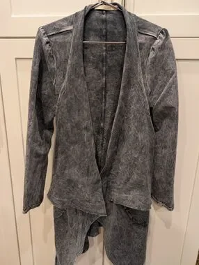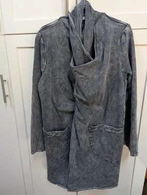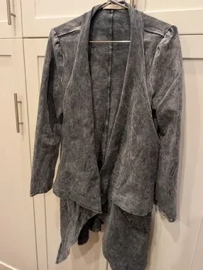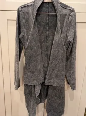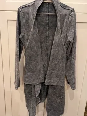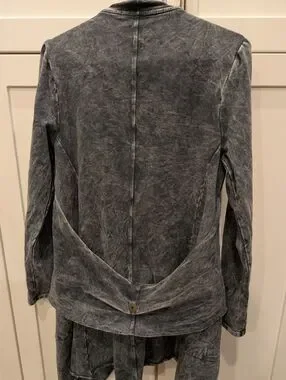 🌿 Testimony French Terry Victorian draped jacket. Distressed, grey, acid-wash style denim look finish, large pockets, peplum back wrap accent, long sleeves, open design, this unlined jacket is suitable for all seasons and can be machine washed for easy care. Waterfall open front that drapes around lower back. Versatile- can be worn many different ways. Unique styling, buttoned detail at lower back. Fits a bit on the smaller side.