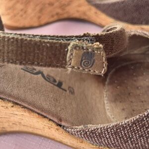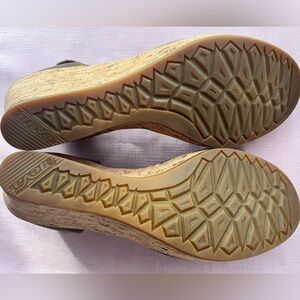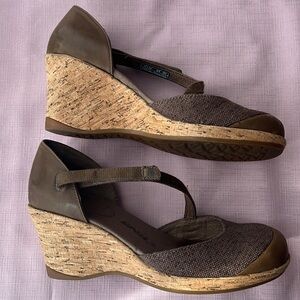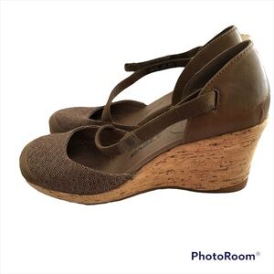 Teva Riviera cork wedged platform sandal with canvas and leather design with a Velcro cross vamp strap. Closed Brown Leather & canvas toe. Cork 3” Wedge Heel Sandals. Summer office wear. These are gorgeous shoes for work places requiring a closed toe.