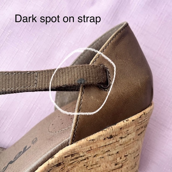 Teva Riviera cork wedged platform sandal with canvas and leather design with a Velcro cross vamp strap. Closed Brown Leather & canvas toe. Cork 3” Wedge Heel Sandals. Summer office wear. These are gorgeous shoes for work places requiring a closed toe.