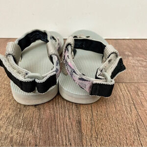 Teva The Original Sandal Grey Geometric. Born on a river as two watchbands and a pair of flip flops, the world's first sport sandal grew up into an icon of freedom and comfort. Finished with earth-friendly Unifi recycled polyester straps that stand up to abuse while keeping plastic waste out of landfills. Grey with pink geometric print on the straps. Size 7. Good used condition, some pulling on the embroidery on the straps but soles are not worn out at all.