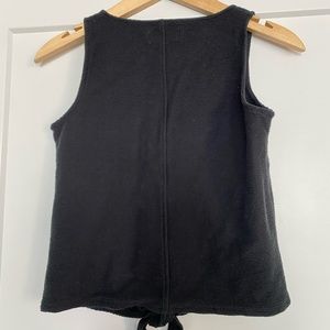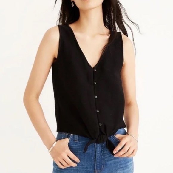 Black tank top with buttons along the front. V-neck front with ribbed stretchy material. Cute little tie front detail at the bottom!