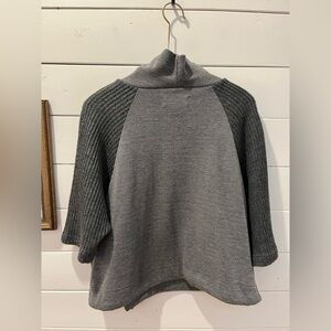 Cozy and modern two-tone grey pullover with a relaxed fit. Features a structured funnel neckline, ribbed 3/4 raglan sleeves, and a soft diagonal knit body. Adjustable drawstrings at the hem for a customizable silhouette. A stylish and comfortable option for everyday wear.
