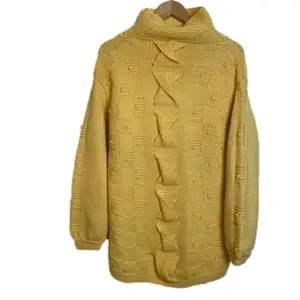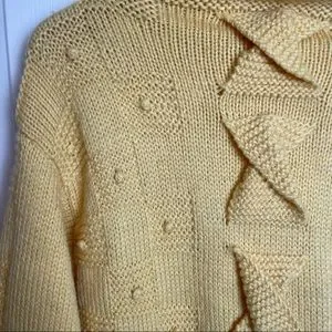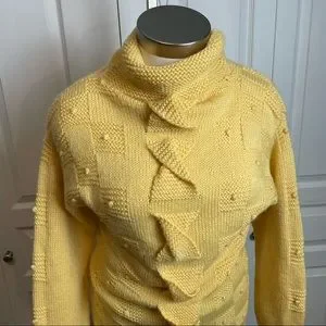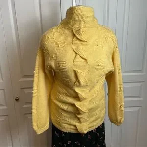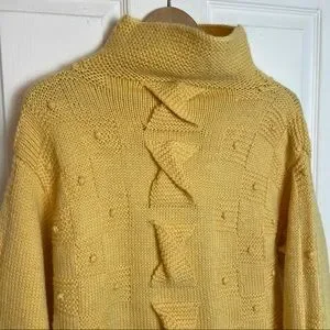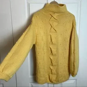 Textured, buttery goodness! Funnel/mock neck with textured detailing throughout. Check out those knitted twists down the front! She’s in excellent condition, with no signs of having been worn. There aren’t tags, but is likely wool/acrylic blend and best fit fit size large. Please check msmts for desired fit.