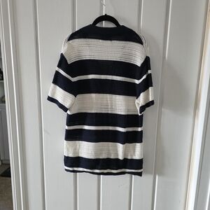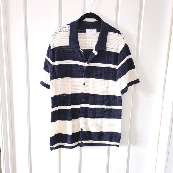 Old Navy short-sleeve knit polo in navy and white stripes. Lightweight, breathable fabric with a relaxed fit. Easy-to-wear casual style that pairs well with jeans or chinos.