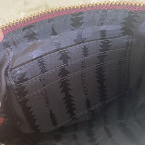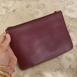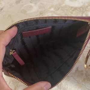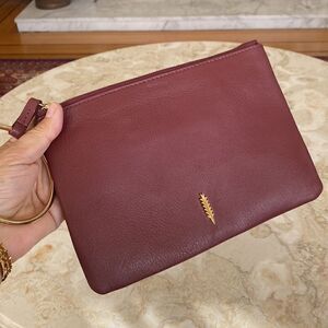 Thacker New York genuine leather wristlet in practically new condition. Beautiful burgundy leather and gold tone metal logo and heavy gold tone wrist ring. Zippered top, interior is cloth lined with 3 credit card slots and a zippered pocket.