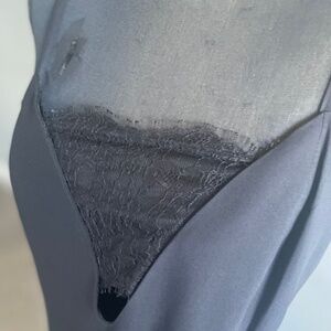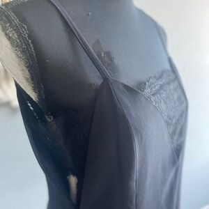 Black silk crepe (62% Acetate, 38% Silk). Sleeveless. Straight-Neckline with mesh and lace detailing. Hidden side zipper. Partially lined.