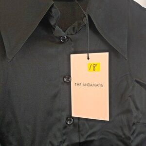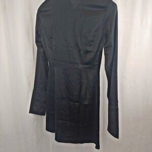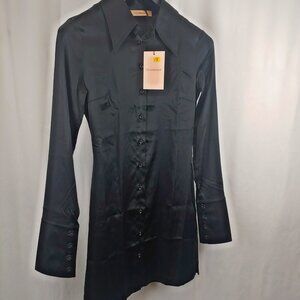 Sexy Chic form-fitting mini shirtdress in stretch silk satin with a crisp point collar.