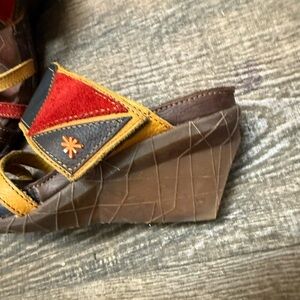 The Art Company size 7 worm one time! These sandals showcase a striking red and yellow color palette with intricate geometric strap designs. The wedge heel offers a stylish lift, while the contoured footbed ensures comfort throughout the day.