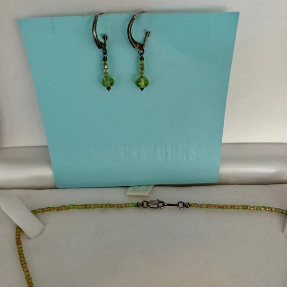 The Artworks green beaded earring and necklace set. Artisan made. Very delicate and dainty. Comes with padded jewelry box.