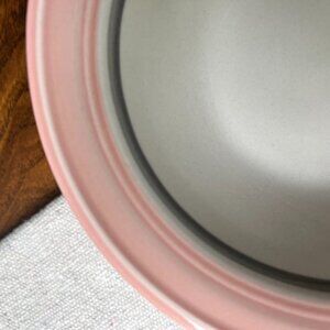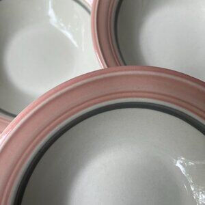 Description ๐ข๐ด๐ก๐ต 4 cereal/soup bowls, made expressly for The Bay. These stoneware bowls are made in Japan. The bowls feature a "Dusty Rose" pattern, with a light pink stripe along the rim, accented with a subtle gray. The bowls themselves are a light cream color.