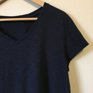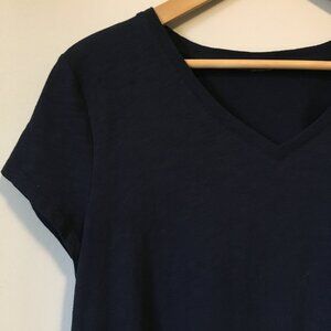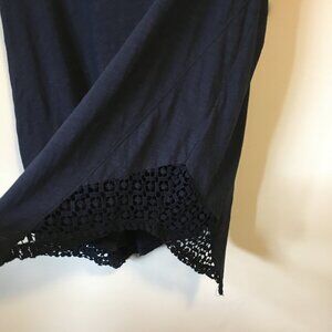 Very good preowned condition, dark navy blue/almost black, almost cap sleeve/short sleeve, A-line fit handkerchief hem tee with beautiful crochet lace inserts by unknown brand. It was made for The Bay, whatever brand it may be. A sweet piece.