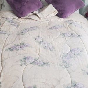 A reversible Twin bed Comforter from The Bay. Larger lavender and beige Floral pattern front, small lavender Floral pattern back. Comes with 1 large pillow case.