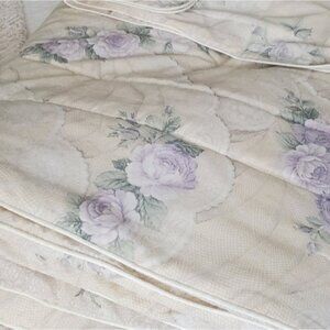 A reversible Twin bed Comforter from The Bay. Larger lavender and beige Floral pattern front, small lavender Floral pattern back. Comes with 1 large pillow case.