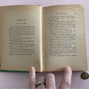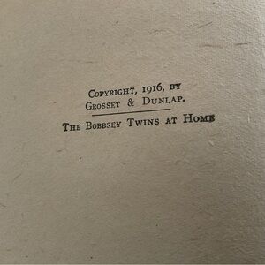 Classic green hardcover book titled 'The Bobbsey Twins at Home' by Laura Lee Hope. Dust cover is missing and there are a few marks and bangs that comes from age. Take a look at date parents gave to their child - 1946. Book is in good shape otherwise- check pics out.