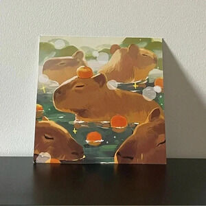This refined composition features five majestic Carabaynas—the world’s largest rodents—in a serene aquatic setting, delicately interwoven with four radiant, orange apples. One Carabayna, in a display of sublime poise, balances an apple upon its head, symbolizing both unity with and distinction from its environment. 🍎
