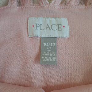 The Children's Place girls' dress, size large (10/12), in light pink. The dress is lined with a braided stripe pattern and mesh cutout overlay. It features a halter top, A-line shape, short length, and pullover style.