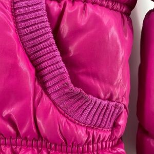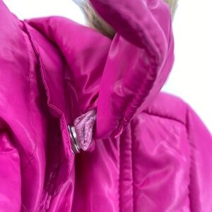 Has a stain on the pocket hood snap needs a couple stitches Barbie core pink faux fur hood trim size large jacket in pink. This one is longer for extra style and warmth. Very good condition with minor signs of wear. Size Large 10/12 kids. Faux fur trim.