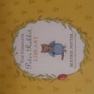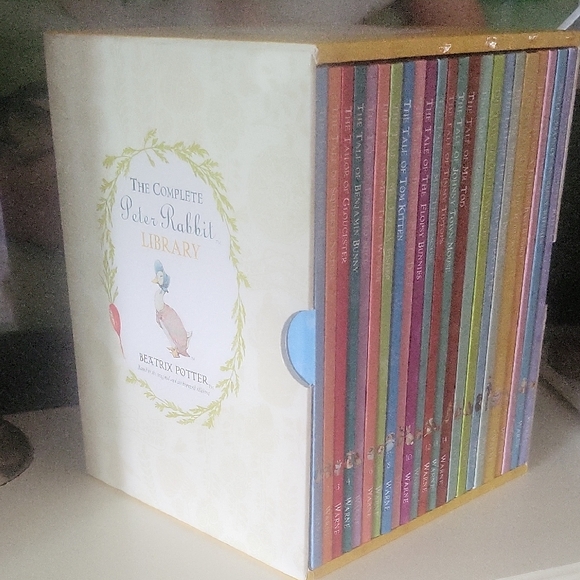 The Complete Peter Rabbit Library by Beatrix Potter. Includes colorful book spines in a decorative box.