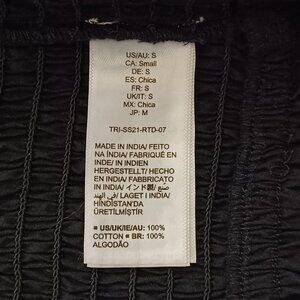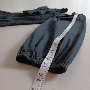 A day-to-night top in a classic black shade. Made from airy, breathable cotton. The smocked bodice has a comfortable stretch fit and the ruffled hem hits at the waistline. The sleeves have elastic cuffs with a secure yet relaxed fit. Perfect for spring and summer, or layer it up for fall and winter looks. New with tags. Excellent condition.