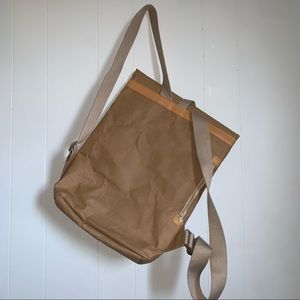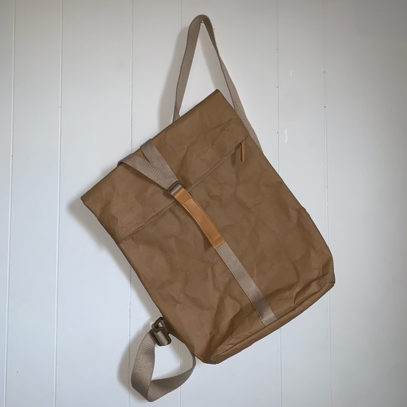 The Explorer - Humming Kraft washable paper backpack w/ webbed straps, Velcro closure and began leather details. Back zipper allows for easy access to backpack contents. Overall size 3”D x 13.75”W x 17”H (22”H when open).