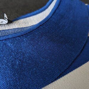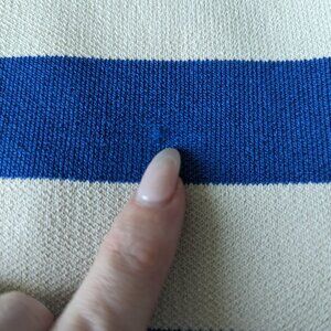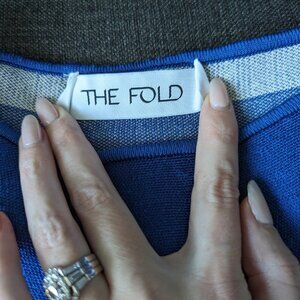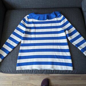 This lovely blue and off white striped top from designer brand The Fold London is in very good used condition. No noted holes, areas of excess wear. There is some very light wear on the collar (see close up), a tiny pull (photo included) and a small stain (also photographed). All very hard to see. Features wide cerulean blue and off white stripes with a blue flounce collar. Sleeves are 3/4 length. Fabric is thick and feels lovely and high quality it is from their sculpt knit collection.