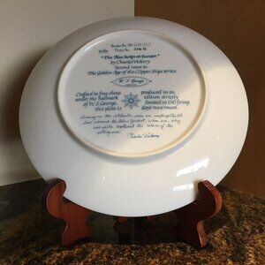 Very good preowned vintage condition, limited edition decorative plate titled 'The Blue Jacket At Sunset' by the talented artist Charles Vickery featuring an illustration of the clipper ship, The Blue Jacket as it sails over the Atlantic with the artist on board. A gorgeous piece and the second issue from The Golden Age of the Clipper Ship Series for W. S. George. White porcelain with gold paint along the rim. From the 90s. Love the pink sky.