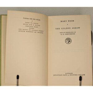 "The Golden Arrow" is a romance novel by award winning English Novelist, Mary Webb, author of Gone To Earth. This 1933 edition has an Introduction by G. K. Chesterton and is published by Jonathan Cape, London. It has a green hardbound cover with gold lettering and decoration on the spine and a gold embossed author's signature on the cover.