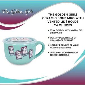 Enjoy your favourite hot or cold beverage with a touch of nostalgia using the Golden Girls Soup Mug. Featuring a vibrant turquoise blue hue, this large, round ceramic mug is inspired by the beloved 80s sitcom, showcasing the iconic characters Dorothy, Blanche, Rose, and Sophia in a charming design perfect for any occasion. Crafted for convenience and durability, the mug includes a vented lid to keep spills at bay and is made from break/chip-resistant material that's dishwasher safe for easy cleanup. Whether it's for a casual cup of coffee or a cosy soup on a chilly day, this unisex mug is a fun addition to any kitchen collection.