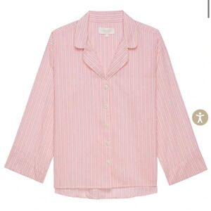 Made for cozy moments at home, The Pajama Shirt. references men’s vintage pajama tops that we’ve always loved to borrow. Roomy and drapey, it features an open neckline, button front, and nostalgic sleepwear details. Size 3= Large