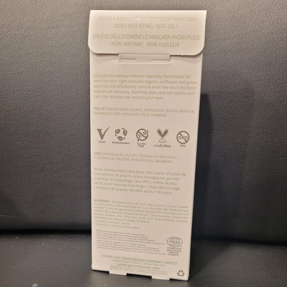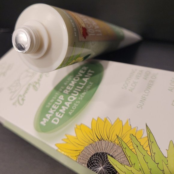 "This ultra-gentle natural makeup remover effectively cleanses sensitive skin. It contains organic sunflower oil and grape oil for effortless makeup removal, even the most stubborn of waterproof mascaras. Aloe vera also naturally relieves irritation in the delicate eye area. Natural ingredients so you can take care of yourself and your planet."