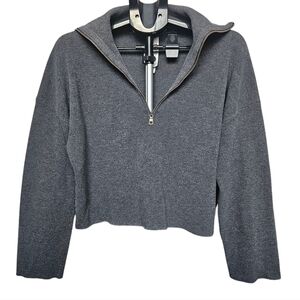 Quarter zip sweatshirt with turtleneck that folds down. It also is relatively stretchy.