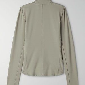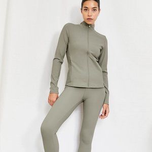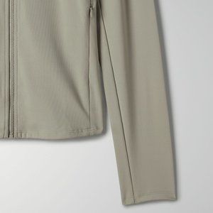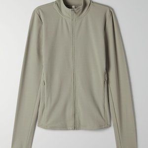 This is a mock-neck, zip-up jacket. It's made from high-stretch, sweat-wicking slick nylon.