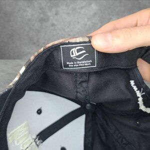 camo strapback, realtree pattern, distressed, black camouflage, woodland print, outdoor style, rugged, 90s-inspired, adjustable cap