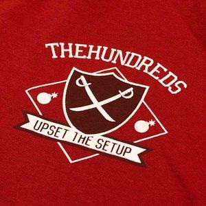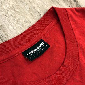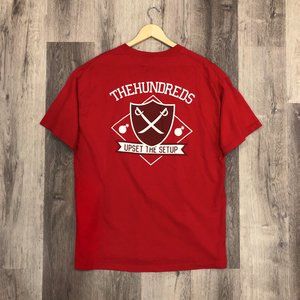 The Hundreds t-shirt in bright red with white and deep red graphic screenprints on the front chest and back.