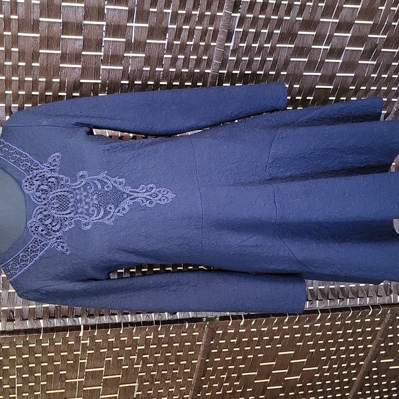 This stunning blue sheath dress by The Kooples features a crew neck adorned with intricate lace detail, adding a touch of elegance. The fitted silhouette and long sleeves make it perfect for both work and casual occasions. Crafted from a soft fabric, it drapes beautifully, ensuring comfort and style.
